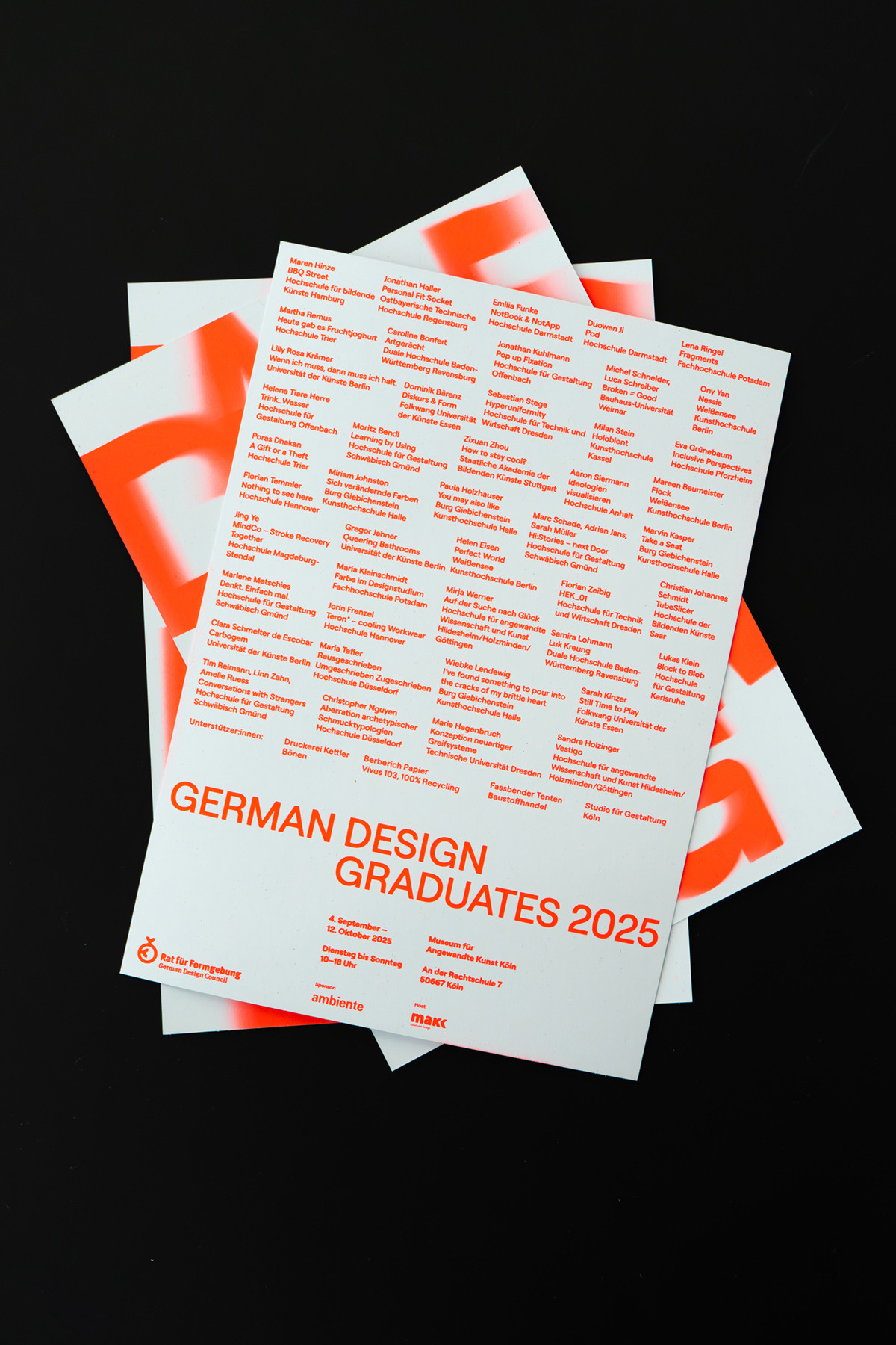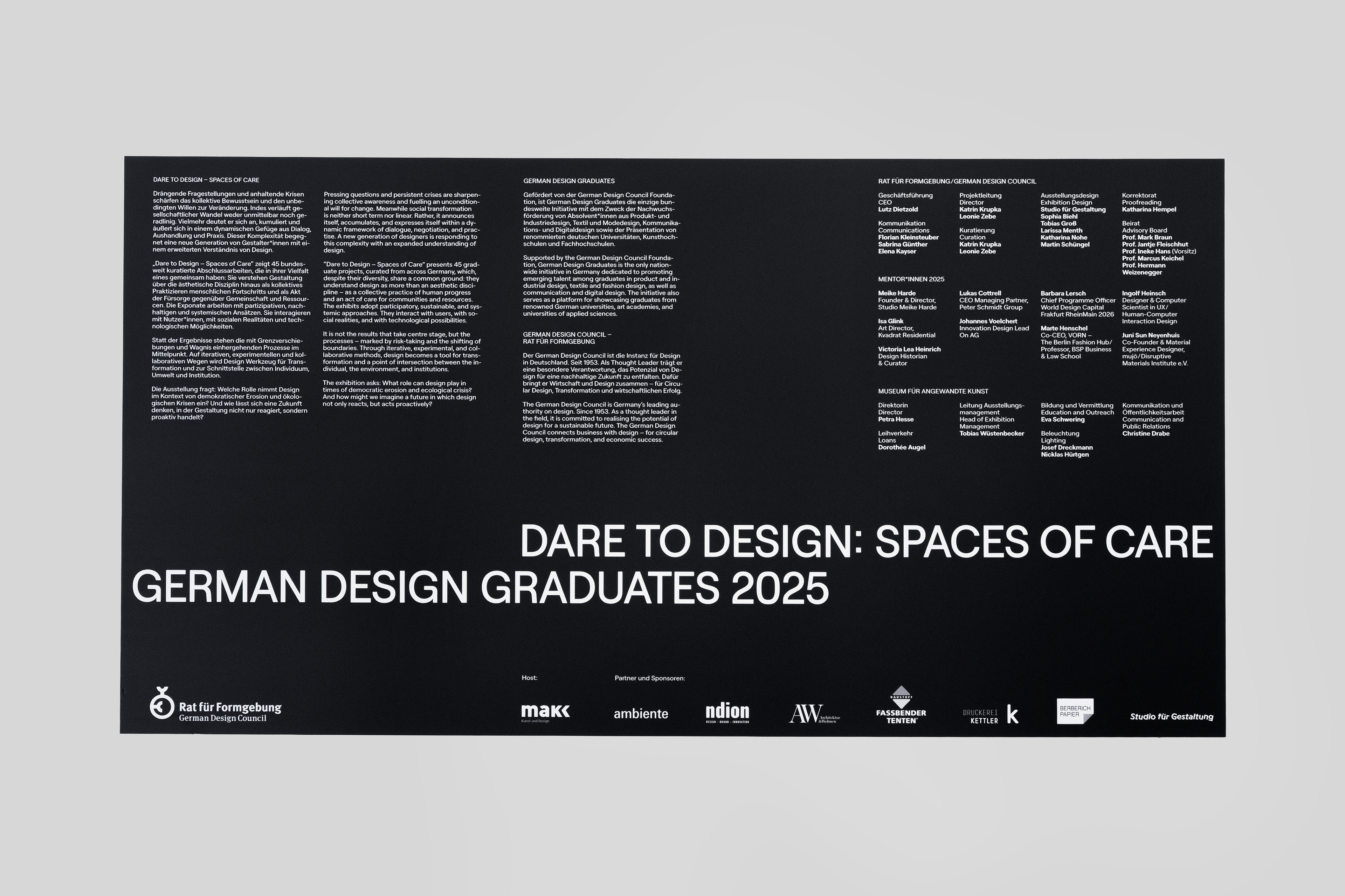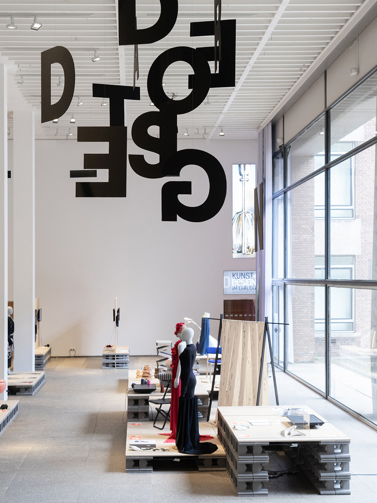 Für die Ausstellung der German Design Graduates im Museum für Angewandte Kunst Köln entstand ein modularer Aufbau, der rund 45 Arbeiten von Studierenden übersichtlich und gleichwertig präsentiert. Die Architektur ist klar, konstruktiv und reduziert, folgt strengen Rasterprinzipien und schafft einen offenen, funktionalen Raum für Kunst und Kultur. Exponate werden flexibel in horizontalen Inseln und vertikalen Paneelen inszeniert, ein bewegtes Buchstaben-Mobile unterstreicht Dynamik und Leichtigkeit. Materialien und Aufbau folgen einem ressourcenschonenden Ansatz, überwiegend geliehene Baustoffe und Textilien werden nach der Ausstellung zurückgeführt.