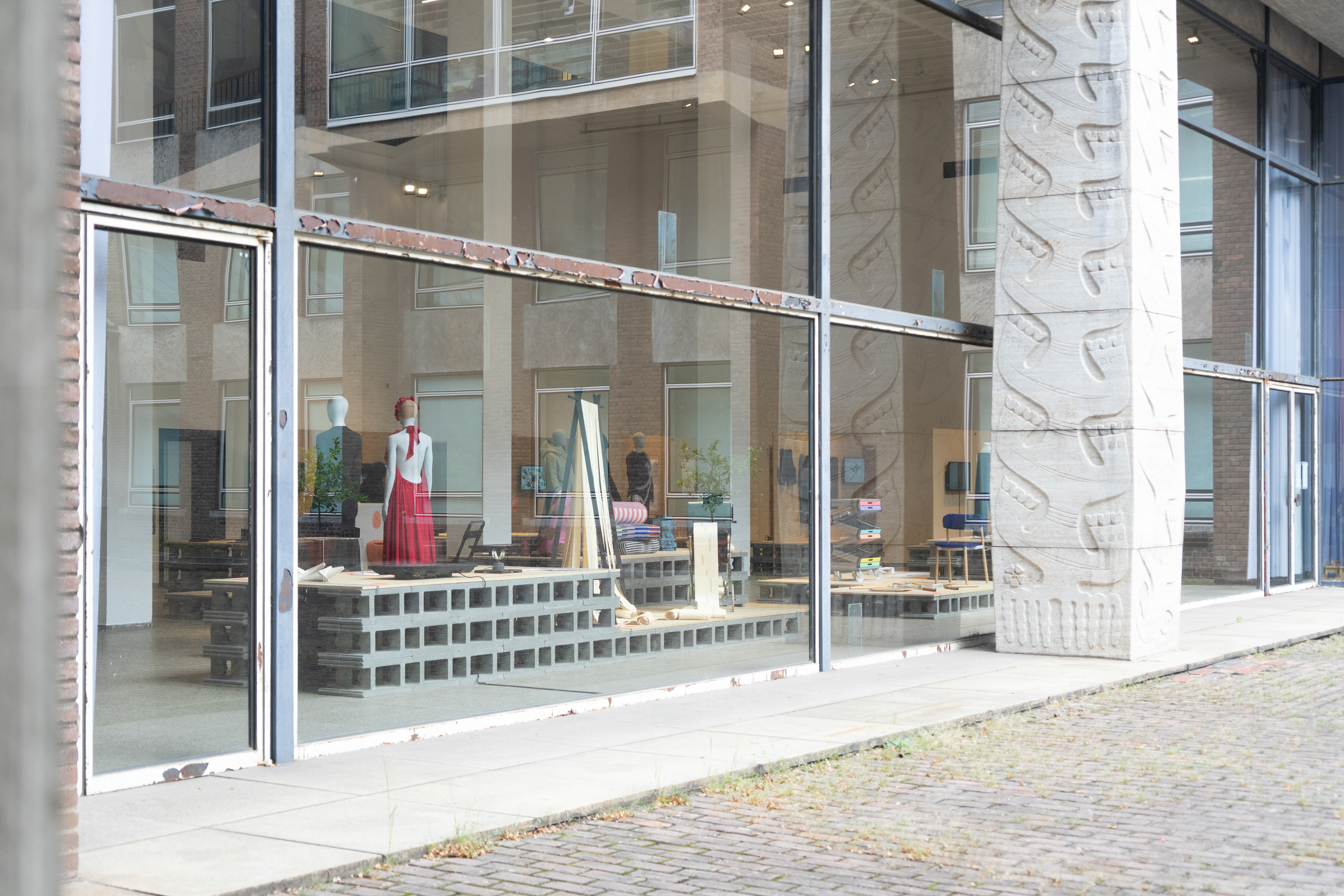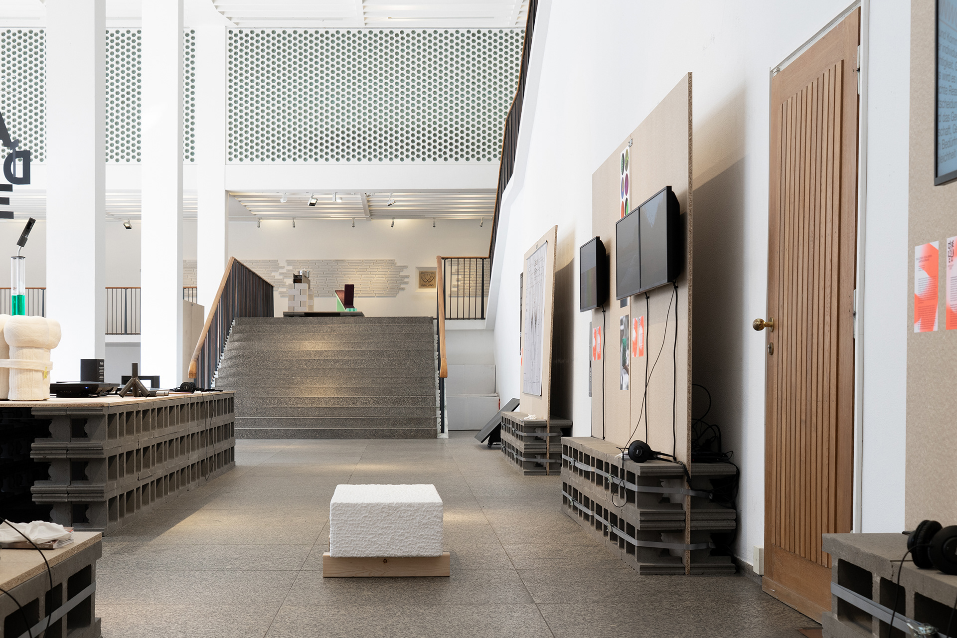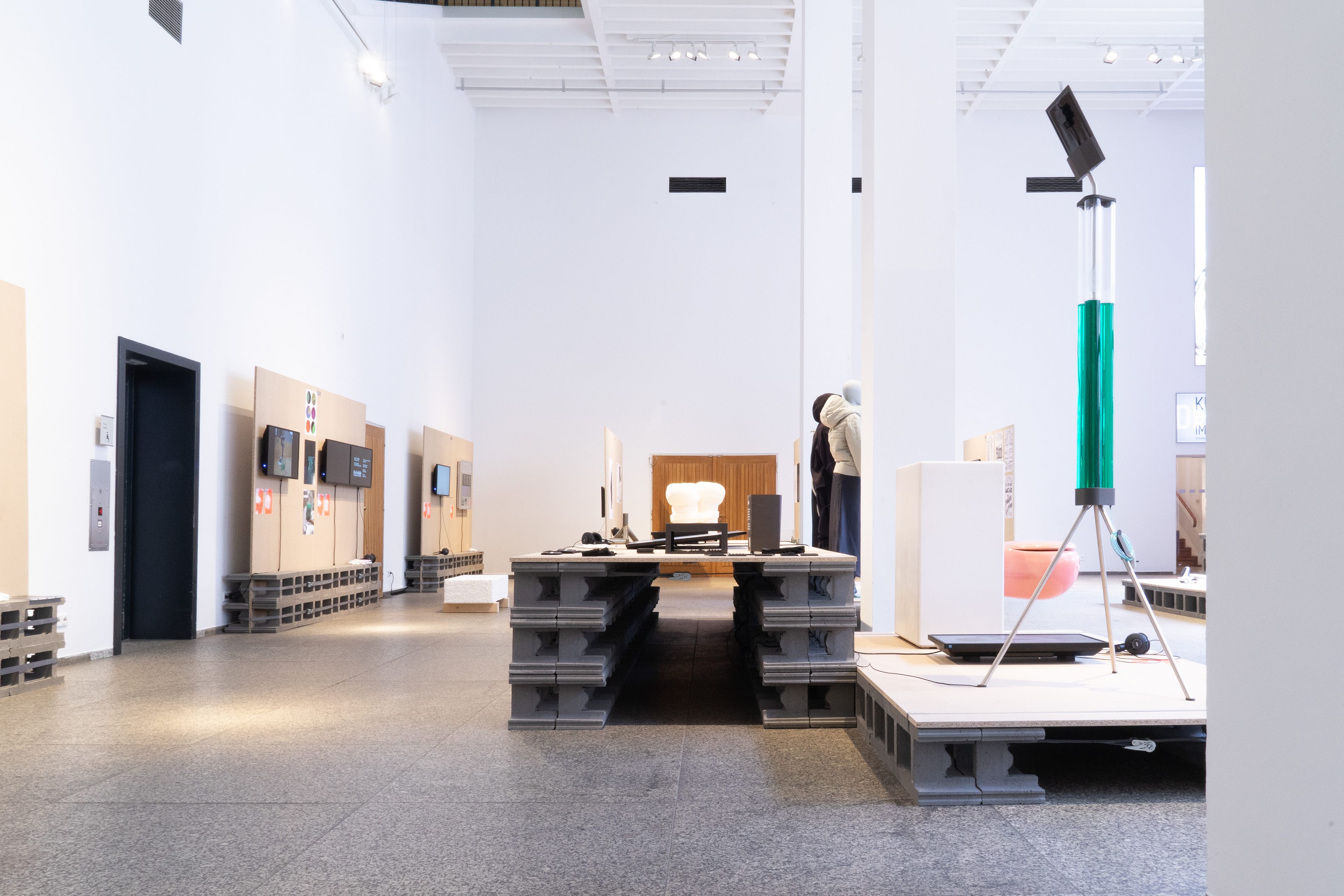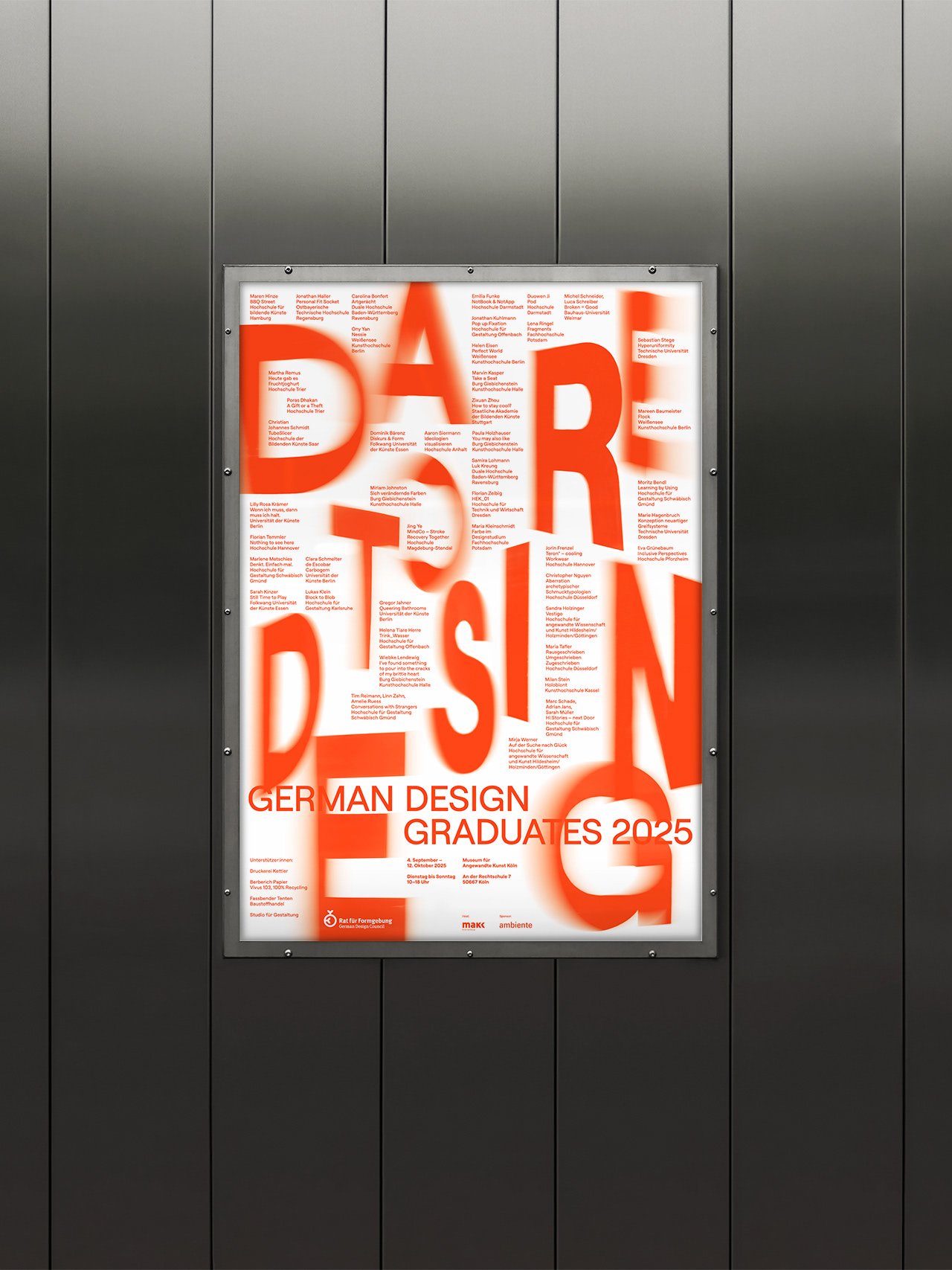 Für die Ausstellung der German Design Graduates im Museum für Angewandte Kunst Köln entstand ein modularer Aufbau, der rund 45 Arbeiten von Studierenden übersichtlich und gleichwertig präsentiert. Die Architektur ist klar, konstruktiv und reduziert, folgt strengen Rasterprinzipien und schafft einen offenen, funktionalen Raum für Kunst und Kultur. Exponate werden flexibel in horizontalen Inseln und vertikalen Paneelen inszeniert, ein bewegtes Buchstaben-Mobile unterstreicht Dynamik und Leichtigkeit. Materialien und Aufbau folgen einem ressourcenschonenden Ansatz, überwiegend geliehene Baustoffe und Textilien werden nach der Ausstellung zurückgeführt.
