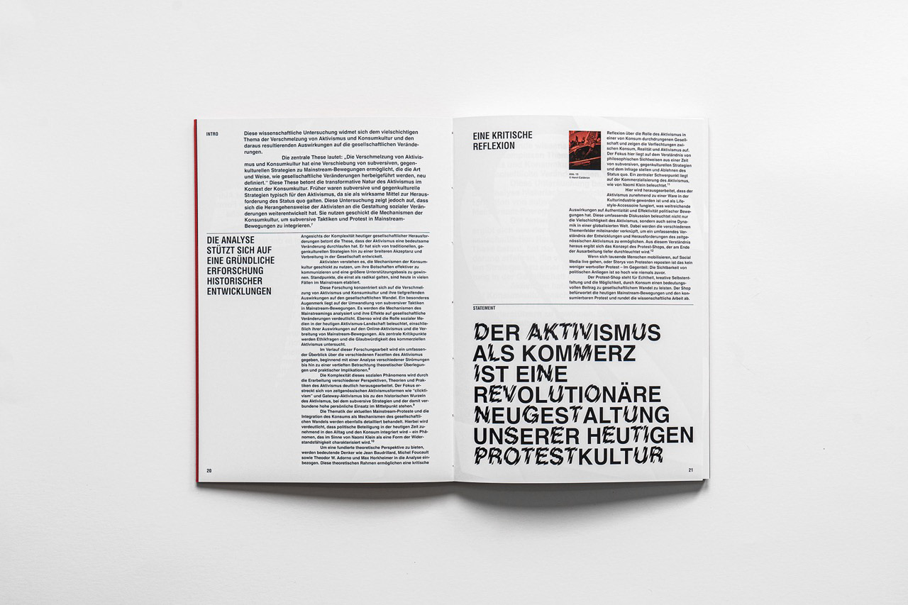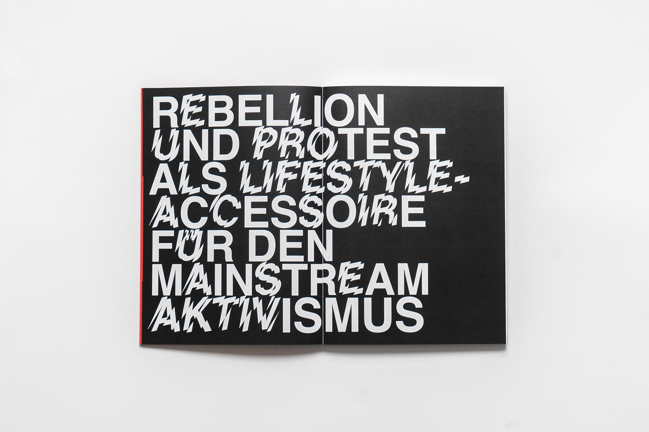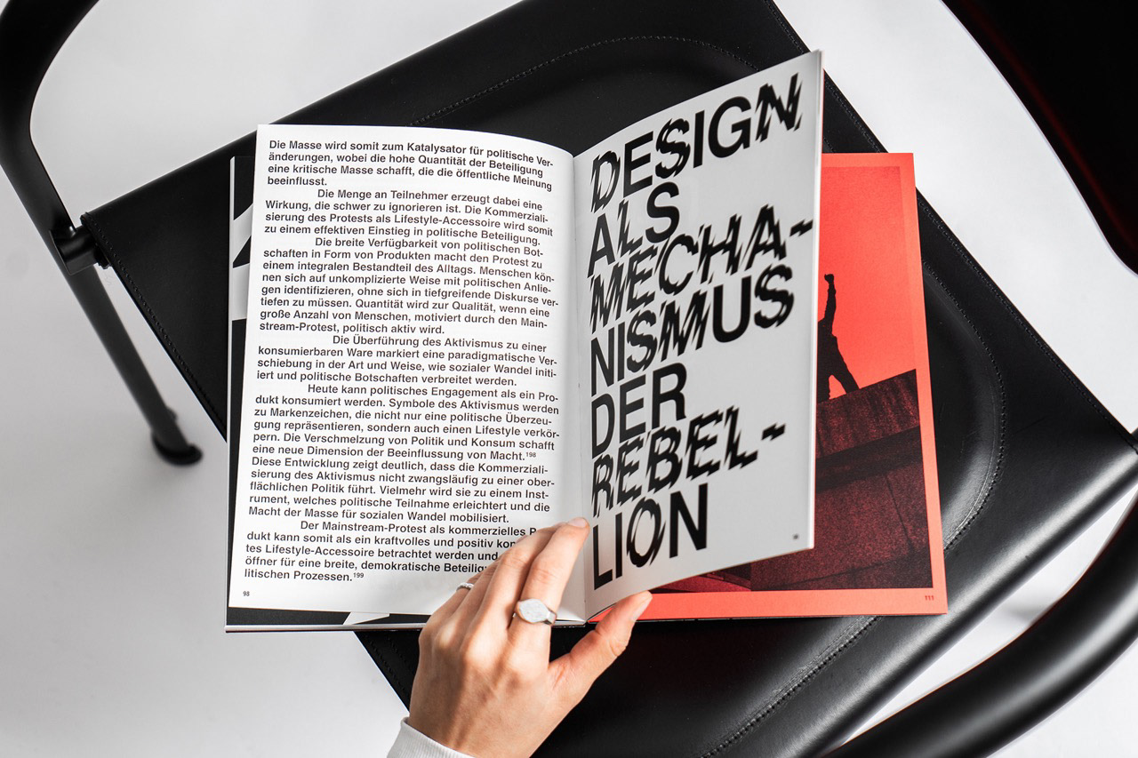 Für eine Designausstellung in Düsseldorf entstand ein Buch zum Thema Protest und Kommerz, das Inhalte und Gestaltung eng verzahnt. In seiner Gestaltung durchbricht das Werk bewusst Konventionen: Typografie und Layout setzen auf mathematische Logik und Unkonventionalität, erzeugen visuelle Spannung und spiegeln die rebellische Natur der Inhalte wider. So wird das Buch zu einem eigenständigen Editorial-Objekt, das Konzept, Inhalt und Design auf professionelle Weise verbindet.