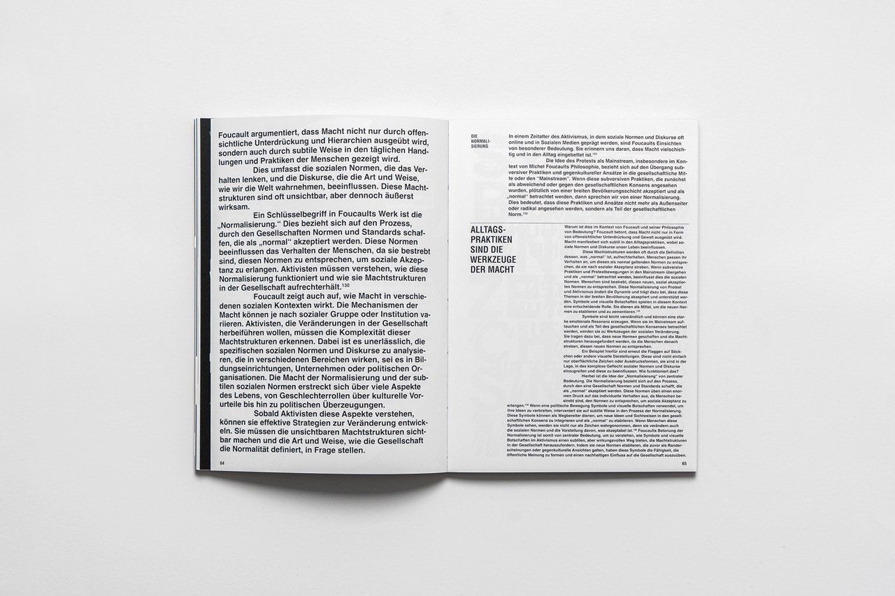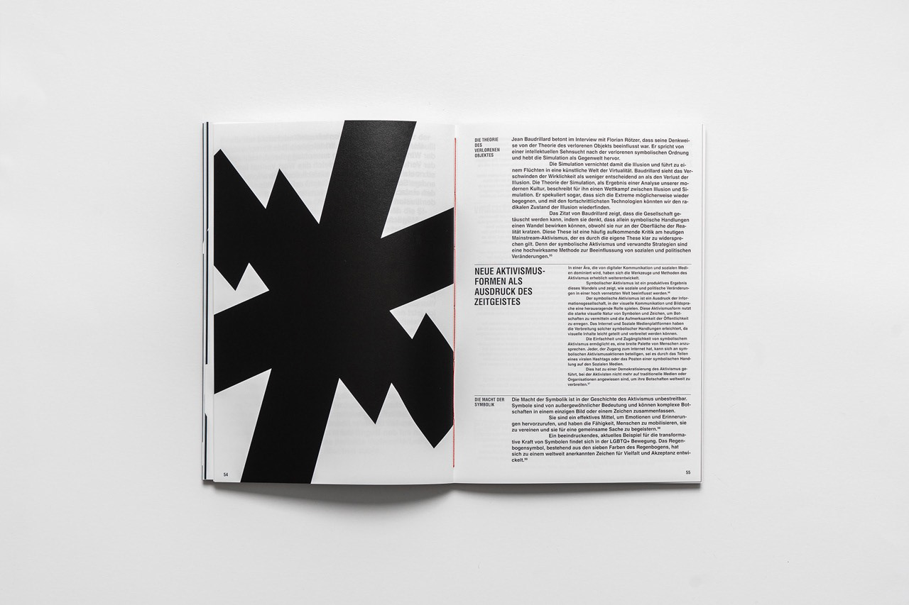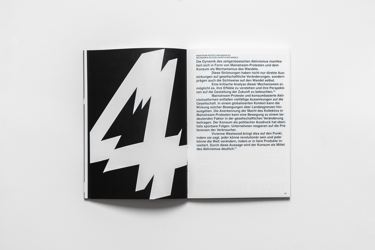 Für eine Designausstellung in Düsseldorf entstand ein Buch zum Thema Protest und Kommerz, das Inhalte und Gestaltung eng verzahnt. In seiner Gestaltung durchbricht das Werk bewusst Konventionen: Typografie und Layout setzen auf mathematische Logik und Unkonventionalität, erzeugen visuelle Spannung und spiegeln die rebellische Natur der Inhalte wider. So wird das Buch zu einem eigenständigen Editorial-Objekt, das Konzept, Inhalt und Design auf professionelle Weise verbindet.